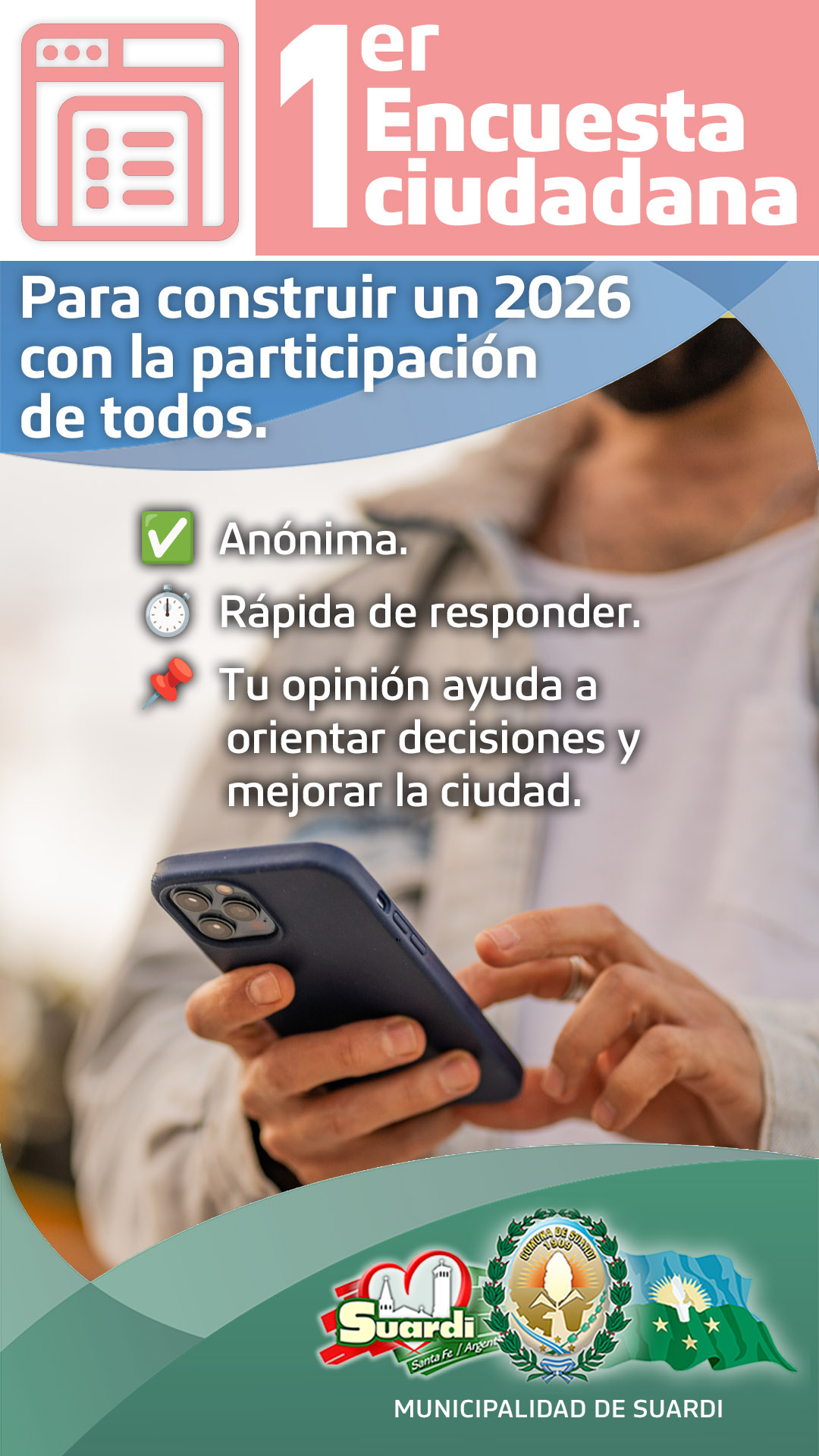 La Municipalidad de Suardi invita a toda la comunidad a participar de una nueva encuesta abierta, con el objetivo de conocer necesidades, requerimientos y prioridades de los vecinos, en el marco de una gestión orientada a la mejora constante y a la participación ciudadana.