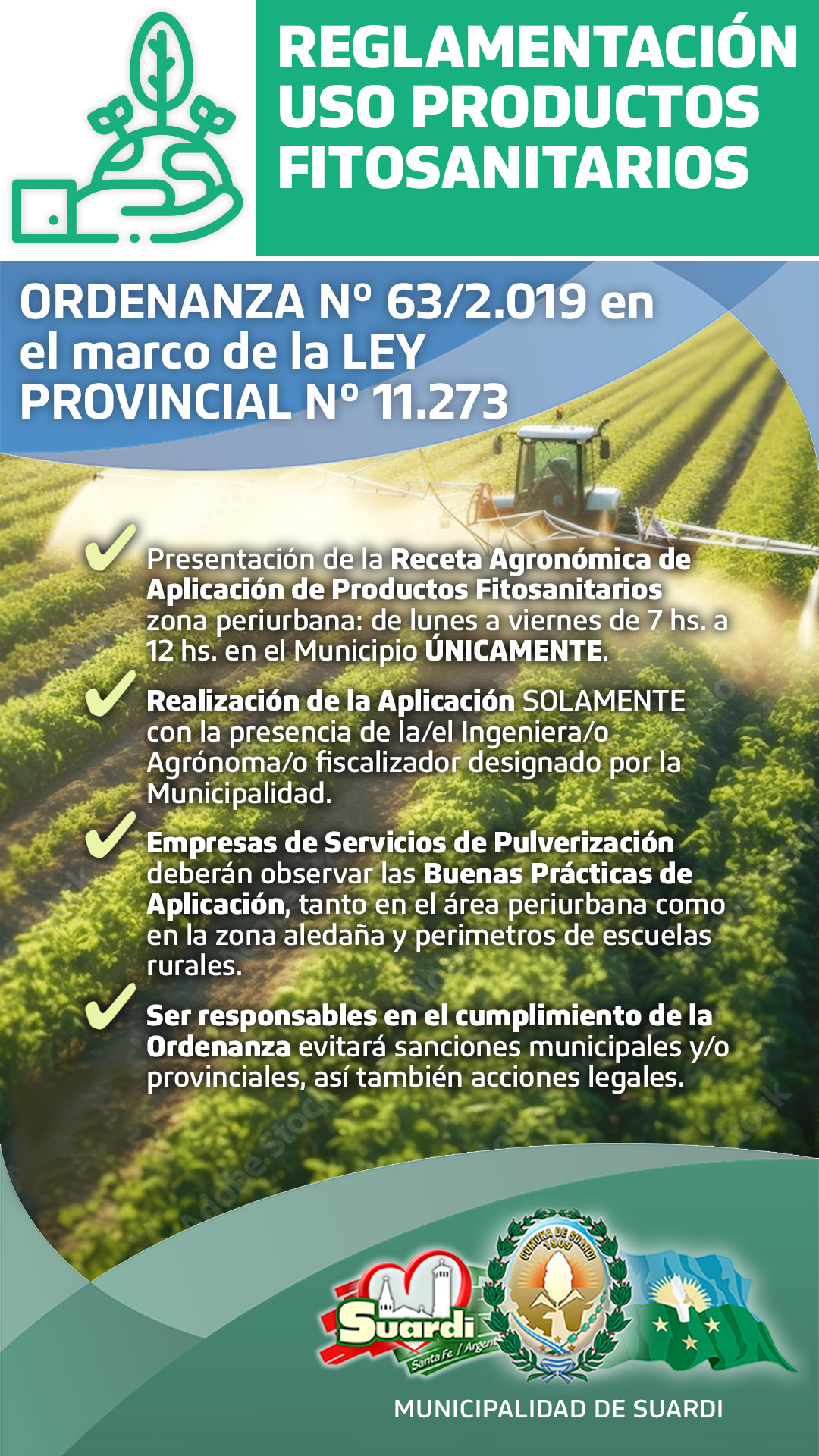 La Municipalidad de Suardi informa a productores, aplicadores y empresas de servicios de pulverización que se encuentra vigente la obligación de presentar la Receta Agronómica para la aplicación de productos fitosanitarios en el ejido urbano y zonas comprendidas por la normativa local.