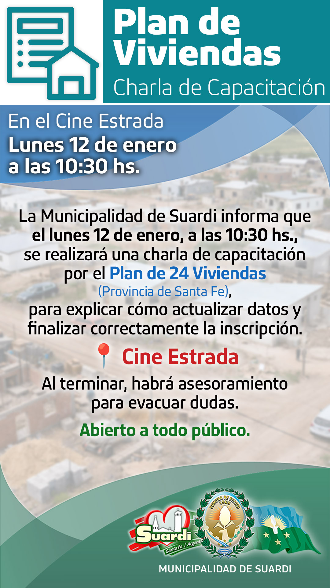 La Municipalidad de Suardi informa a la comunidad que el lunes 12 de enero, a las 10:30 horas, se realizará una charla de capacitación en el marco del Plan de 24 Viviendas que impulsa la Provincia de Santa Fe.